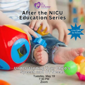 Join us and our guest presenters, Annmarie Demarco, licensed pediatric occupational therapist specializing in fine motor delays, and Drake Hastings , licensed pediatric speech-language pathologist specializing in feeding and speech, for Tiny Miracles’ next After the NICU Education Series.  Both therapists maintain their own private practice and work with Birth to Three.