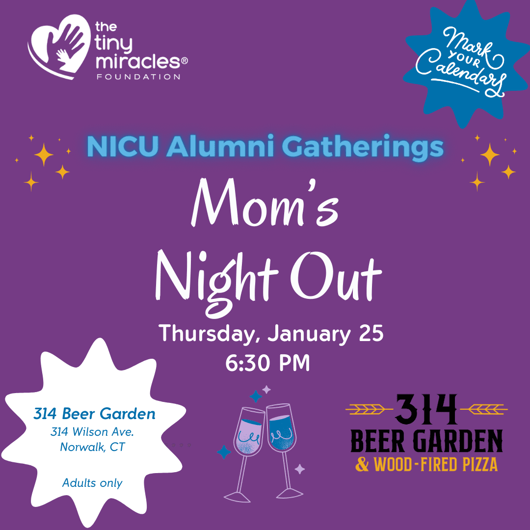 Thursday, January 25 6:30 PM 314 Beer Garden 314 Wilson Ave. in Norwalk All NICU moms, past and present, welcome. Appetizers and first drink compliments of Tiny Miracles. Look for your host in the Tiny Miracles vest.