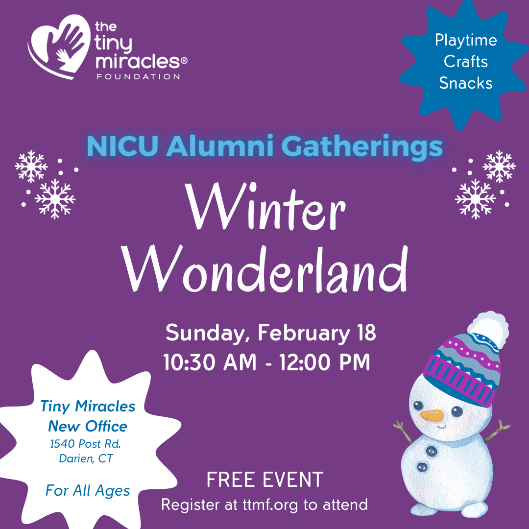 Winter Wonderland NICU Alumni Gathering Sunday, February 18 10:30 AM to 12 PM Tiny Miracles Office 1540 Post Road Darien, CT Cure the winter blues and come celebrate winter with your friends at Tiny Miracles. Parents/Caregivers and preemies and siblings of all ages welcome to join the fun on our new office turf field. Playtime, […]