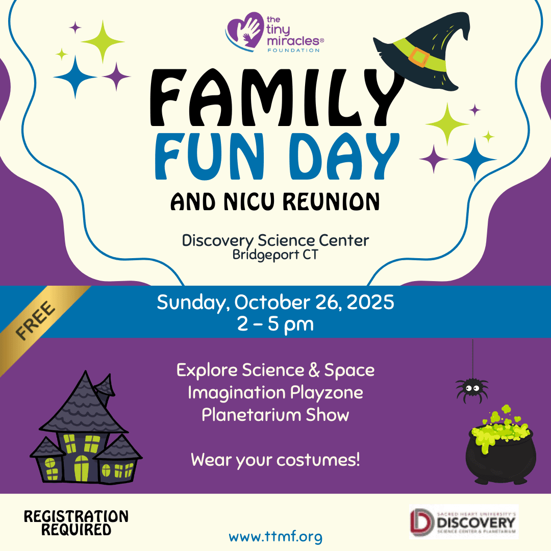 Come trick or treat with Tiny Miracles! Join local NICU Alumni, their parents and siblings for this FREE event: October 26 2-5 PM Discovery Science Center Explore space and science with fun exhibits including a planetarium show and imagination playzone. Lunch included. Costumes encouraged but not required. *** Registration strongly suggested. Please leave TOTAL […]