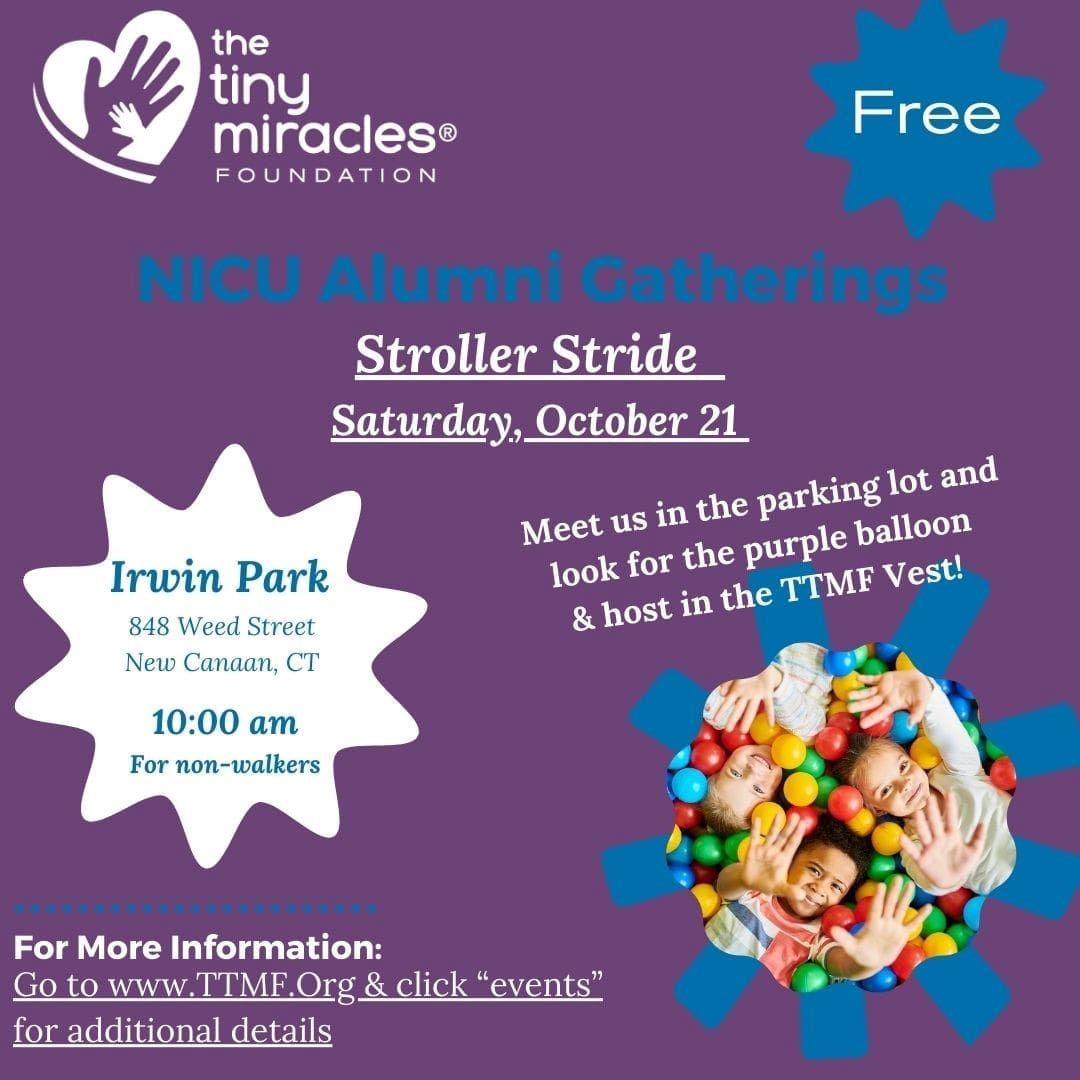 Canceled due to weather forecast. Saturday, October 21 10:00 AM Irwin Park 848 Weed St. in New Canaan Parent/Caregiver and Non-walkers welcome to join us. Meet in the parking lot at 10 am and look for your host with the Tiny Miracles vest.