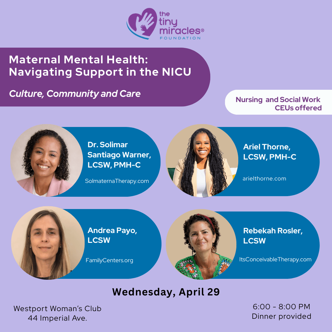 Saturday, March 21 5 - 8 PM Moms & Dads, Sons & Daughters Save the date for our NEW Family Dinner Dance! Come together as a community of preemie parents […] Navigating Support in the NICU April 29, 2026 6:00 - 8:00 PM Westport Woman's Club Join Tiny Miracles and our panel of leading experts for the annual Maternal Mental Health […] Making Strides 2026 Gala Saturday, May 9, 2026 6:30 PM The Loading Dock Stamford, CT ** REGISTRATION COMING SOON ** For sponsorship opportunities, please email ttison@ttmf.org.Events